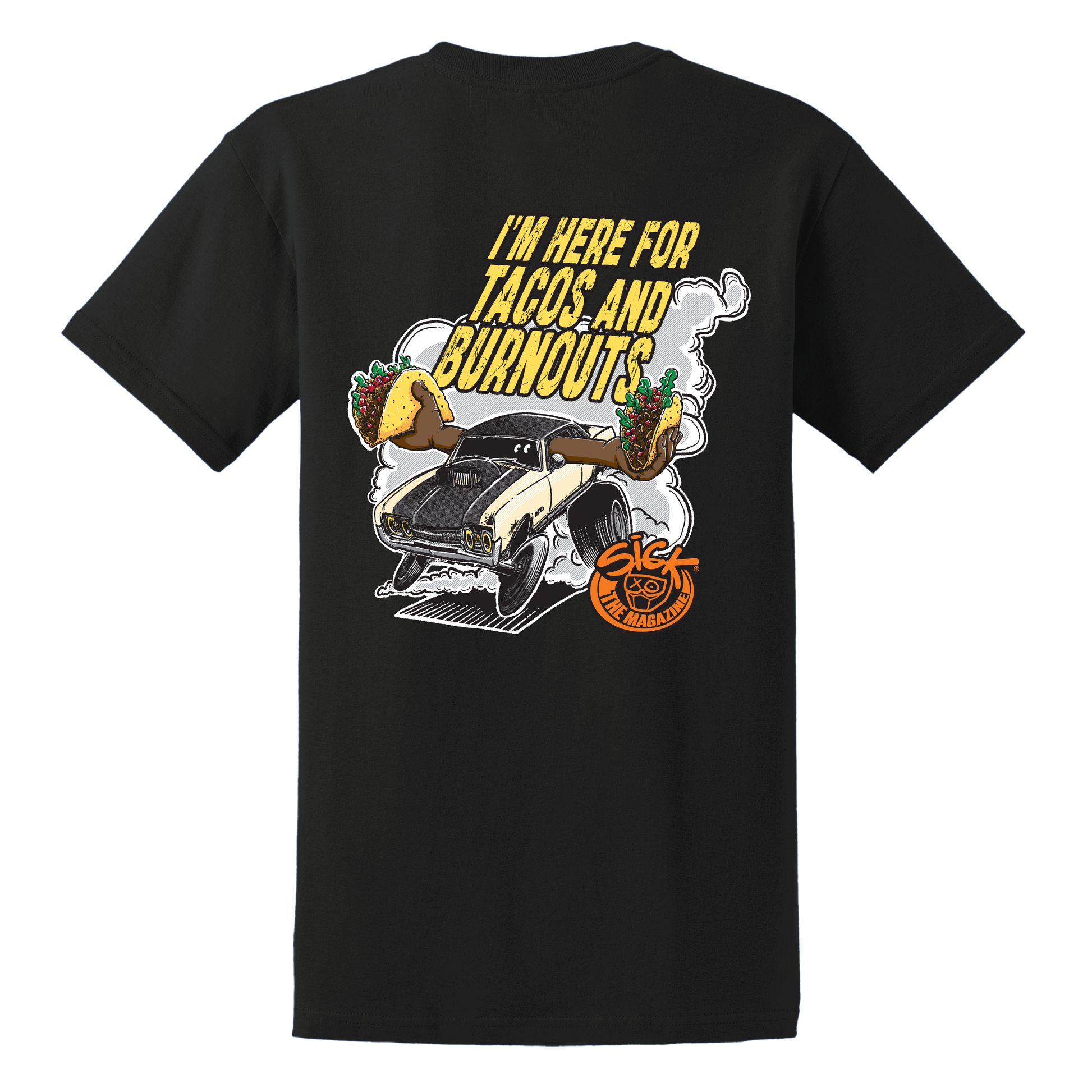 Featuring a bold cartoon muscle car ripping a burnout while slinging tacos, this design delivers loud energy without taking itself too seriously. The front keeps it clean with a small chest hit, while the back goes full send with a high-impact graphic and Sick The Magazine branding.